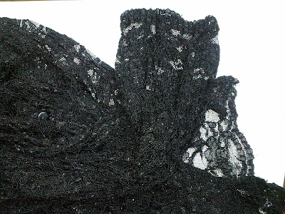 Pitsi on peräisin lasten pitsipaidasta, jonka tuli taloon ystävän tuttavan lähettämässä lastenvaatesäkissä. Koska musta pitsipaita olisi mullekin liian ...ööö... raju vaate, en anna sitä Saimille edes naamiaisvaatelaatikkoon. Saimille sopi paidan käyttäminen askarteluihin.
